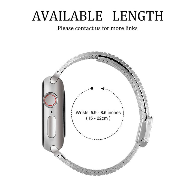 Der er mange gode grunde til at investere i denne udskiftningsrem til dit Apple Watch. Remmen er lavet af førsteklasses rustfrit stål, hvilket gør den utroligt holdbar og robust til daglig brug. Med sit dobbelte spænde design er det nemt at justere størrelsen, så den passer perfekt til dit håndled. Det enkle og stilrene udseende gør den nem at matche med din daglige påklædning, hvilket tilføjer et elegant touch til ethvert outfit. Denne rem er den ideelle erstatning til din gamle eller ødelagte urrem, så du kan give dit Apple Watch et nyt og friskt look. Specifikationerne inkluderer en rem, der passer til håndled med en omkreds fra 15 til 22 cm (5,9 til 8,6 tommer).