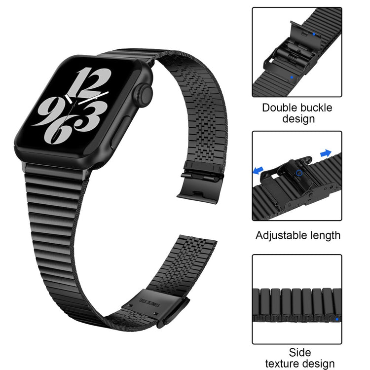 Der er mange gode grunde til, at du bør købe dette produkt: Denne armbåndsudskiftning til Apple Watch er lavet af høj-kvalitets metalmateriale, som sikre, at det kan bæres i lang tid. Den har en opgraderet dobbeltlås-foldespænde, der låser armbåndet sikkert omkring håndleddet. Det er en ideel erstatning for dit gamle eller ødelagte armbånd. Du kan justere længden i henhold til dit håndled, hvilket gør det meget praktisk. Designet er både simpelt og moderne, hvilket gør det velegnet til arbejde, forretning, dagligdagen med mere. Du kan personalisere dit smartwatch med dette sofistikerede erstatningsarmbånd, hvilket gør det unikt og stilfuldt. Disse funktioner gør dette armbånd til en værdifuld investering for enhver Apple Watch ejer.
