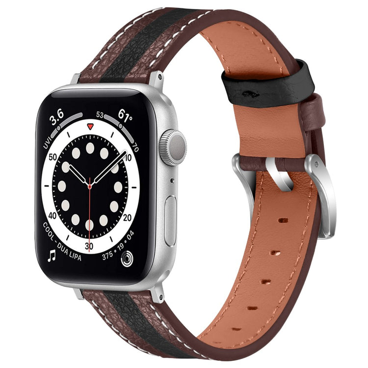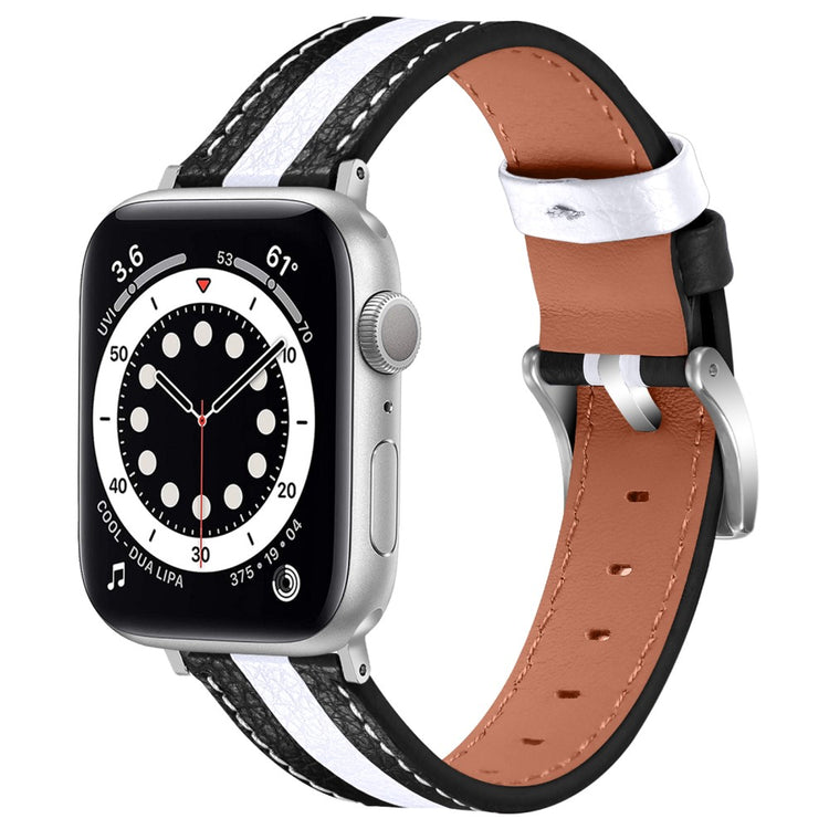 Hvis du er ude efter en ny urrem til din Apple Watch, er denne rem lavet af **ægte læder** det perfekte valg. Den er **blød og komfortabel** at have på, hvilket gør den ideel til daglig brug. Det **moderne farvespil** i designet gør, at urremmen skiller sig ud og tilføjer et **stilfuldt touch** til dit ur. Med en **metalspænde** er remmen nem at tage af og på, hvilket gør din hverdag mere praktisk. De mange huller på remmen gør det desuden let at **justere størrelsen**, så den passer perfekt til dit håndled. Dette er en **ideel erstatning** for din gamle eller ødelagte urrem og giver nyt liv til dit ur. Med en håndledsomkreds mellem **15-22 cm** og en urhornsbredde på **22mm**, passer denne rem til en bred vifte af Apple Watch modeller.