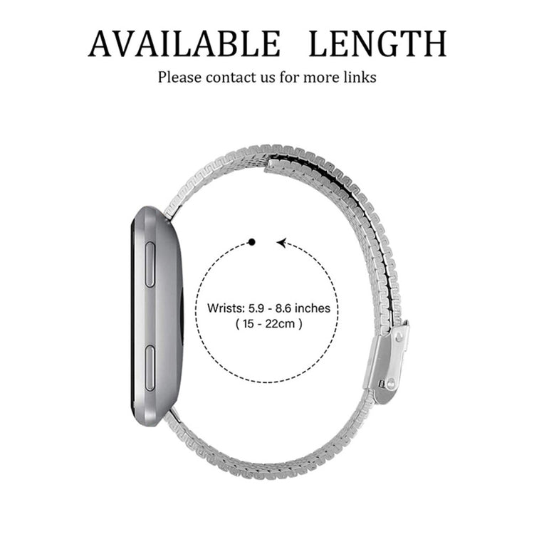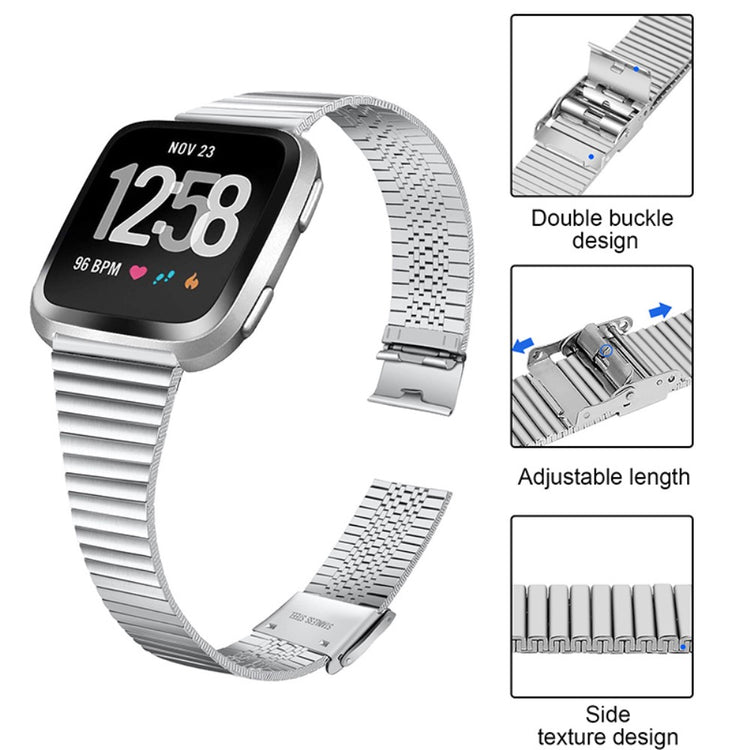 Lav et holdbart og stilfuldt urrem af førsteklasses rustfrit stål med et dobbelt spænde, som er let at justere i størrelsen. Dets enkle udseende gør den nem at matche med dagligt tøj og den er en ideel erstatning for din gamle, ødelagte rem. Kompatibel med Fitbit Versa, Versa 2, Versa Lite og Versa SE, og passer til en håndledsomkreds på 15-22 cm.