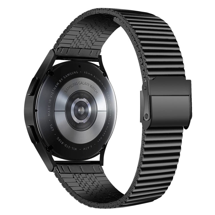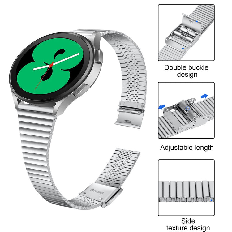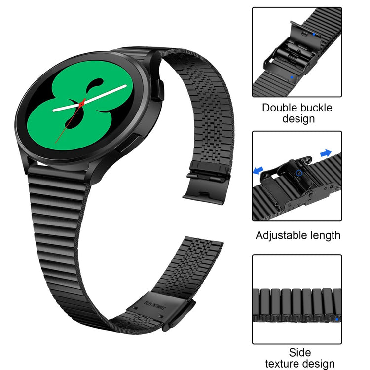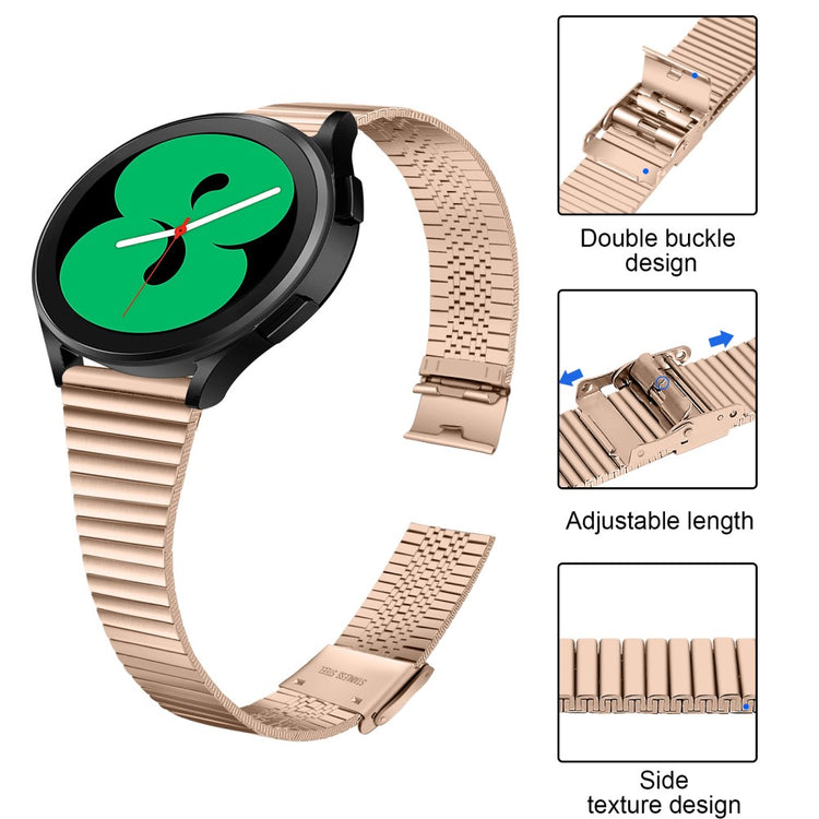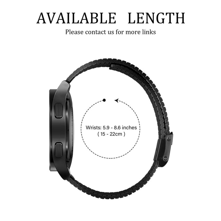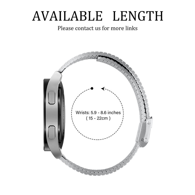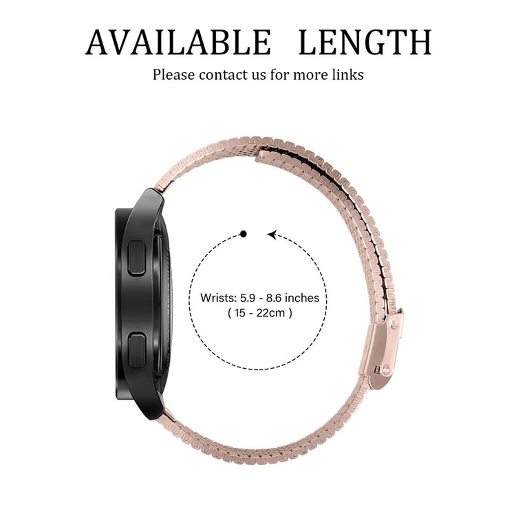 Dette urrem er lavet af høj kvalitets metal og kan bæres i lang tid. Den opgraderede dobbelte lukning sikrer, at remmen sidder sikkert på håndleddet, og længden kan justeres efter behov. Remmen passer til flere enheder som Samsung Galaxy Watch og Huawei Watch GT2, og dens enkle men stilfulde design gør den ideel til både arbejde og hverdag.