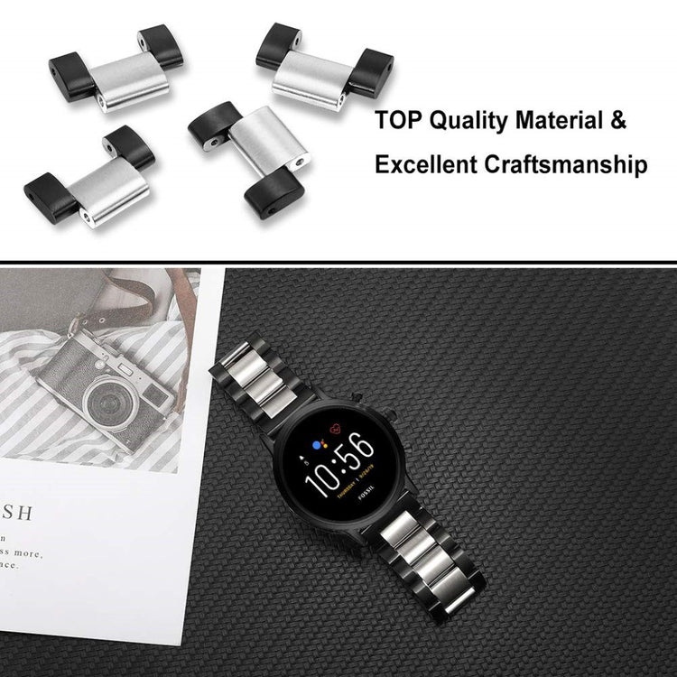 Rustfri stål urrem, holdbar og slidbestandig. Tilpas din ur med denne forfinede rem, længden kan justeres til at passe dit håndled. Hurtig og nem fastgørelse, kompatibel med Fossil Gen 5 Carlyle HR/Julianna HR 22mm.