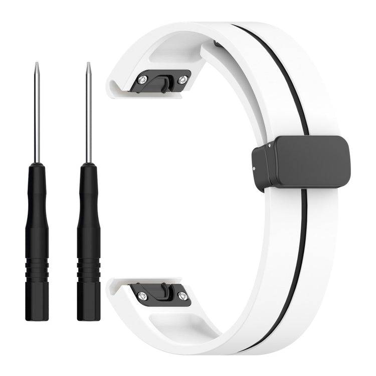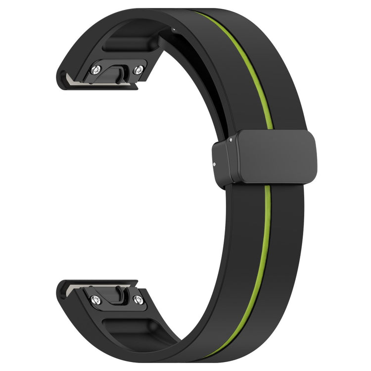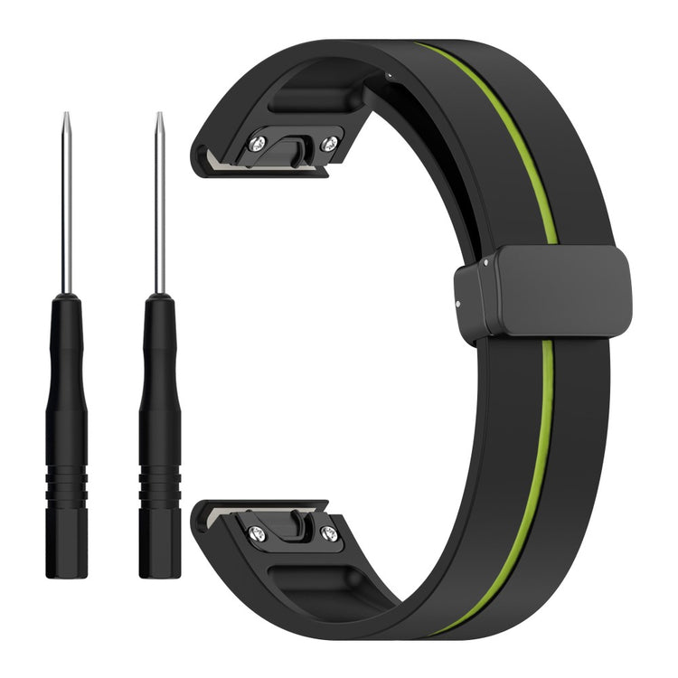 Dette armbånd er det perfekte valg for dig, der ønsker en komfortabel og dæmpet løsning til din smartwatch. Det er lavet af højkvalitets silikone, der sikrer, at det ikke skader huden og ikke forårsager allergiske reaktioner. Den holdbare konstruktion gør, at armbåndet kan anvendes dagligt uden risiko for slid. Den foldbare magnetlås gør det nemt at justere størrelsen og tilpasse det perfekt til dit håndled. Hvis du skal udskifte et gammelt eller beskadiget armbånd, er dette den ideelle erstatning. Med forskellige farver til rådighed kan du finde det, der passer bedst til din stil og dine behov. Det er kompatibelt med flere Garmin-modeller, hvilket gør det til et alsidigt valg. Investér i dette armbånd for at forbedre din hverdag og fuldende dit outfit med elegance.