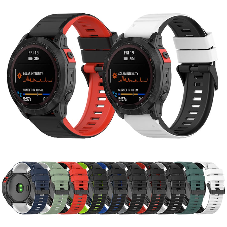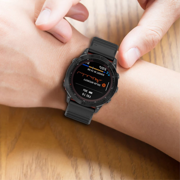 Erstatningsrem til din smartur lavet af miljøvenligt silikone-materiale, der er vand- og svedafvisende. Den justerbare størrelse sikrer en blød og komfortabel pasform, samtidig med at den klasseiske spænde tilføjer et stilrent udtryk. Remmen passer til en række Garmin-modeller og er ideel som erstatning for en gammel eller beskadiget rem.