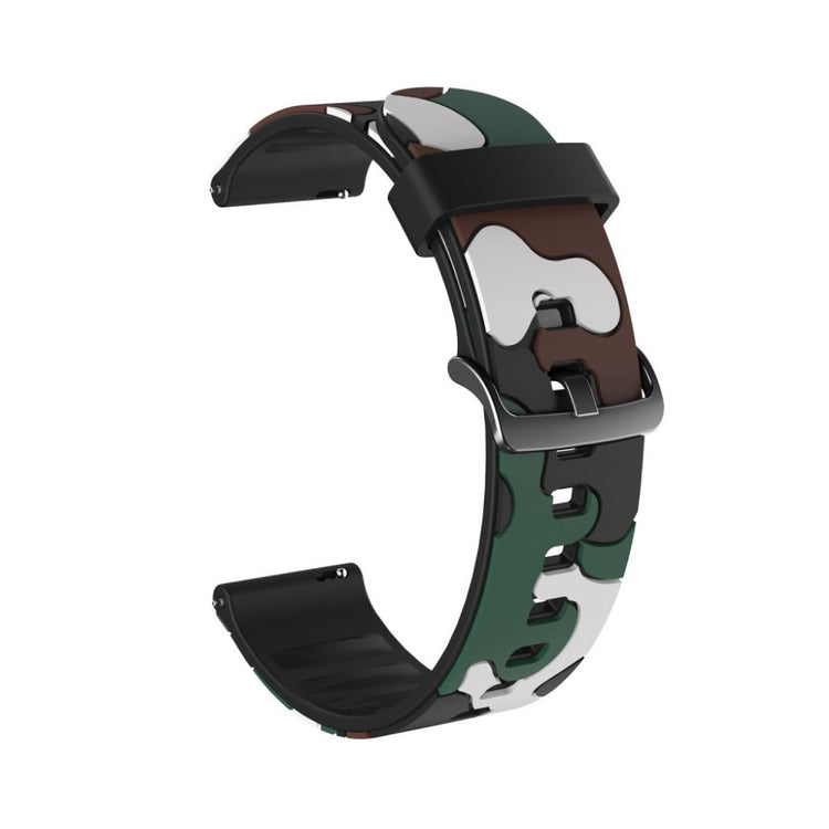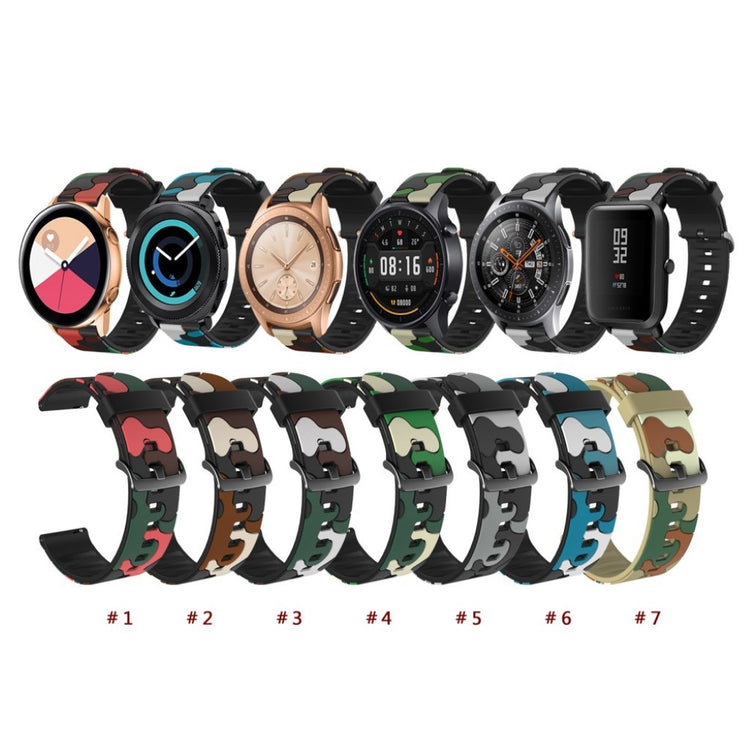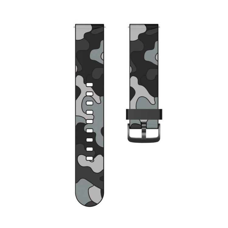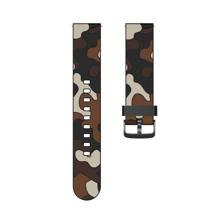 Dette silikoneurrem med camouflage design er kompatibel med flere modeller, herunder Samsung Galaxy Watch og Garmin enheder. Den har en klassisk metalspænde og et design med flere huller, der gør det nemt at justere størrelsen. Det er det perfekte alternativ til din gamle eller beskadigede urrem.