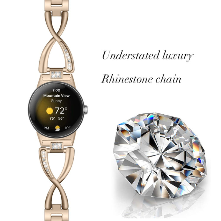 Dette er en fantastisk mulighed for at opgradere din smartwatch med et stilfuldt og unikt armbånd, der vil skille sig ud. Armbåndet er lavet af metalmateriale, hvilket gør det både holdbart og af høj kvalitet. Det er dekoreret med funklende rhinsten, der tilføjer en ekstra dimension af elegance til dit look. Installationen af armbåndet er utroligt nem, og du kan nemt montere det på din smartwatch på få sekunder. Hver detalje i fremstillingsprocessen er omhyggeligt taget i betragtning, hvilket sikrer enestående håndværk, design og æstetik. Dette armbånd er den perfekte erstatning for dit gamle eller beskadigede armbånd, og det passer til håndled med omkreds på 5.5 til 7.8 tommer. Giv din Google Pixel Watch 2 et friskt og personligt præg med dette imponerende armbånd.