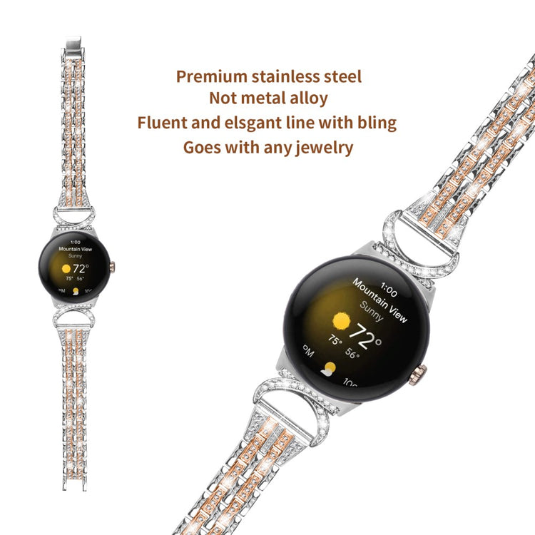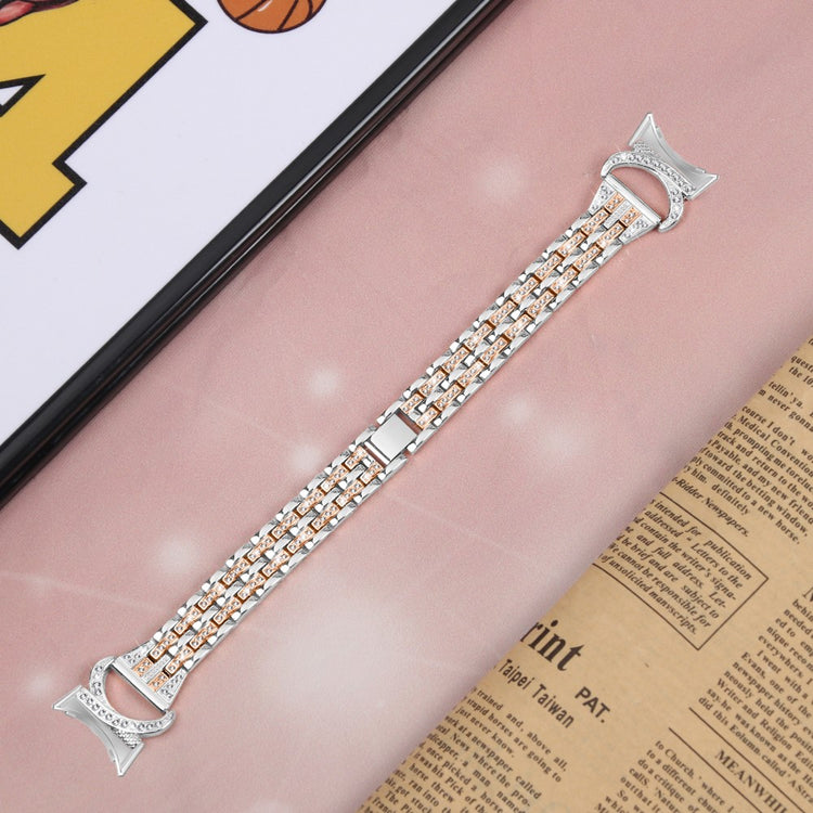 Denne urrem er fremstillet af slidstærkt rustfrit stål og prydet med to rækker glitrende rhinsten, der giver dit smartwatch et unikt og elegant præg.