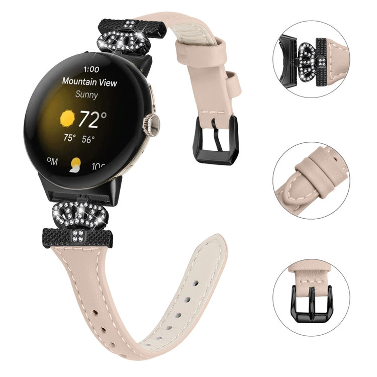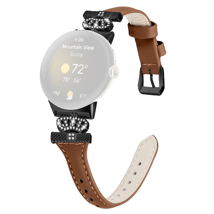 Dette urrem er lavet af højkvalitets ægte læder, der er behageligt at have på og nemt at matche med din daglige påklædning. Den elegante kroneformede forbindelse og de skinnende rhinsten i designet gør dit smartwatch mere smukt og stilfuldt. Urremmen har et multihulles design, der gør det nemt at justere størrelsen og en rustfri stålspænde, der sikrer holdbarhed.