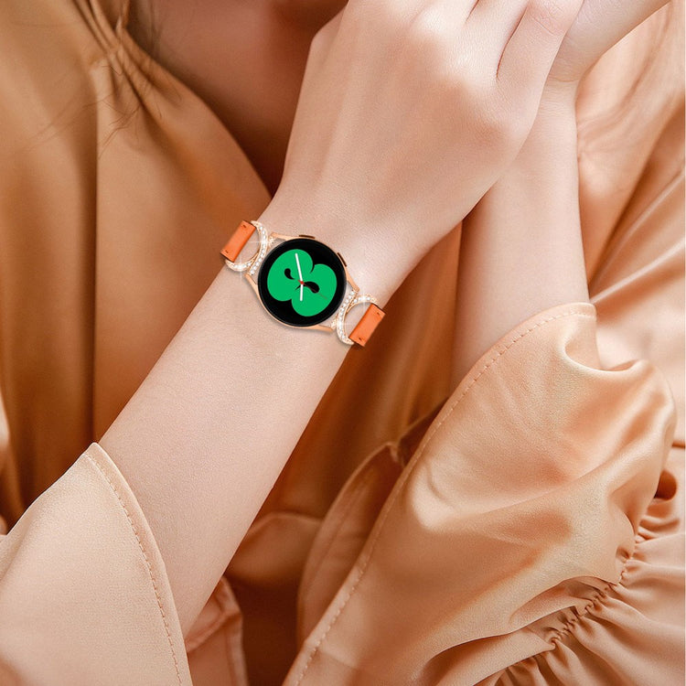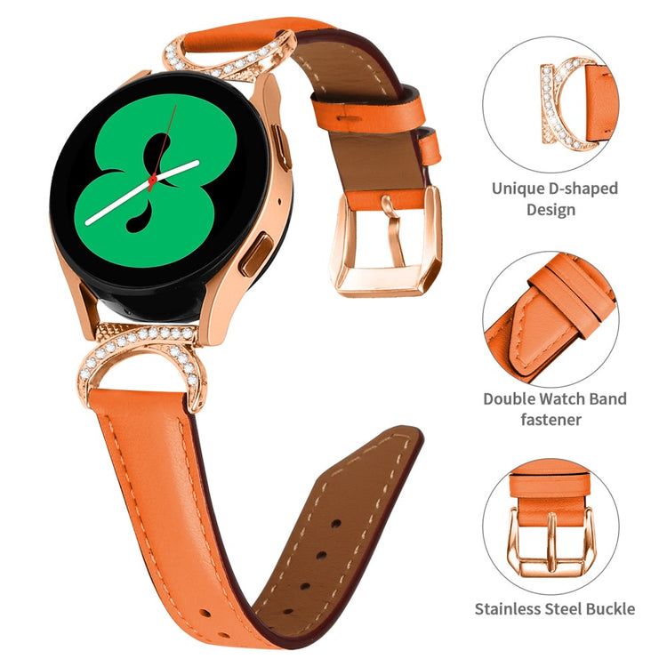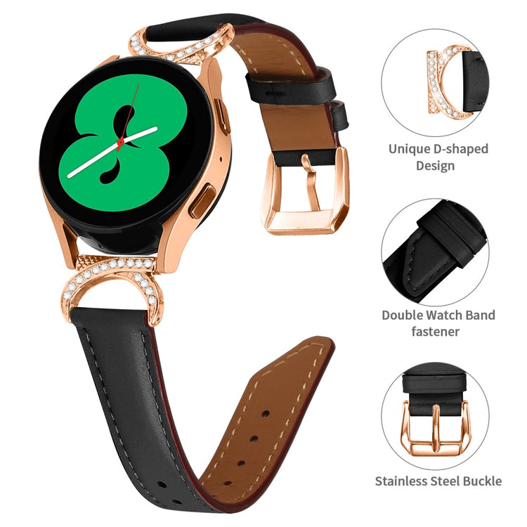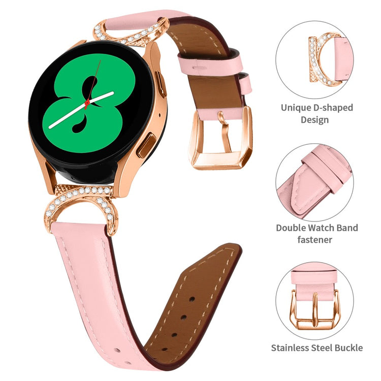 Dette armbånd er lavet af splitleder med elegant håndværk, som er blødt og komfortabelt. Det er designet med rhinestones og en D-formet metallok, der giver et mere elegant og stilfuldt udseende. Armbåndet har en rustfri stålspænde med flere huller, hvilket gør det nemt at justere størrelsen og passer til Samsung Galaxy Watch 3 41mm/Watch 5 40mm/44mm og andre ure med 20mm remme.