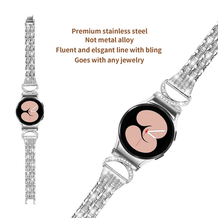 Dette urrem med kobling er lavet af rustfrit stål, hvilket gør det slidstærkt og holdbart. Det har en unik og stilfuld design med to rækker glitrende rhinsten, der personaliserer dit smartwatch. Den praktiske design giver adgang til alle kontroller, knapper, sensorer og funktioner.