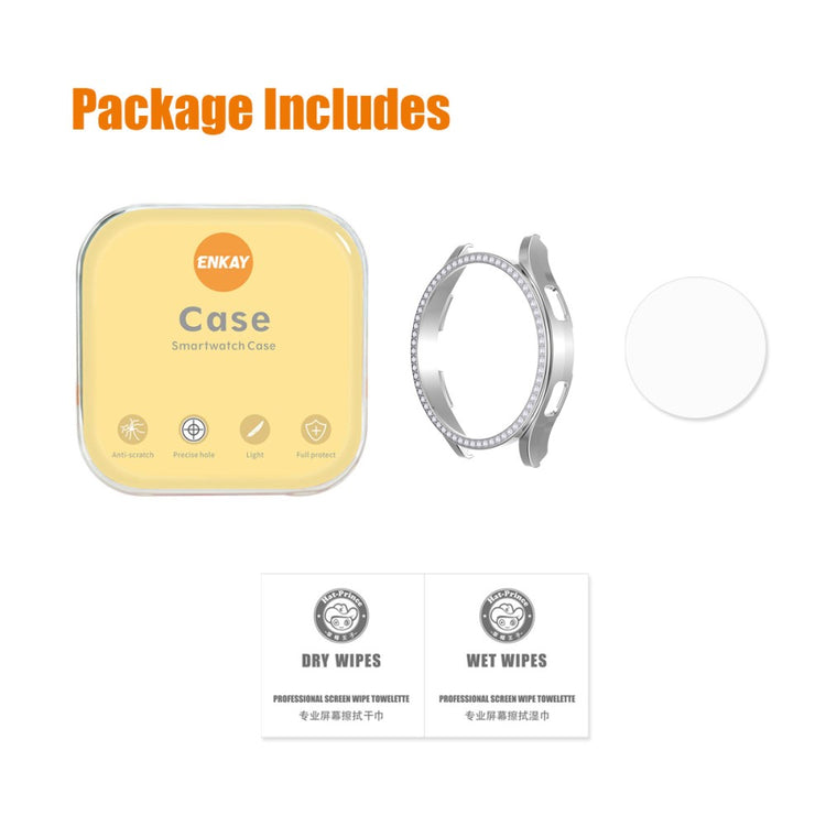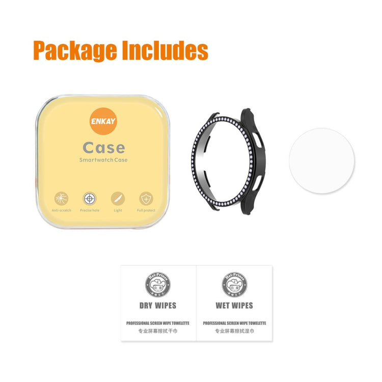 ENKAY HAT PRINCE 2-i-1 skærmfilm i 0,2 mm med anti-fingeraftryk og anti-rids beskytter din smartwatch mod stød og ridser med sit slanke og lette design. Den hærdede glasbeskytter har en 9H hårdhed, der gør den ridsefast og modstandsdygtig overfor olie, vand og fingeraftryk. Den elektroplaterede belægning og rhinsten dekoration giver et skinnende og iøjnefaldende udseende, mens præcise huller sikrer nem adgang til knapperne.
