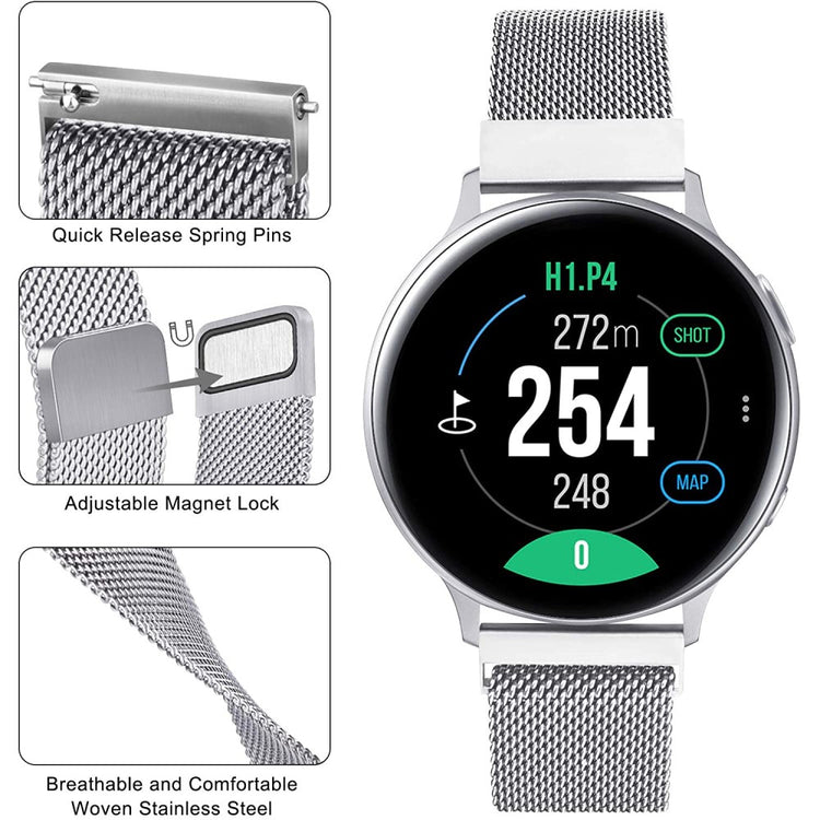 Dette er et ideelt urrem til at erstatte en gammel eller beskadiget. Den har en magnetisk absorptionsdesign, der holder remmen lukket og kan justeres til individuelle håndledsstørrelser. Den er kompatibel med mange modeller som Samsung Galaxy Watch, Garmin og Ticwatch.