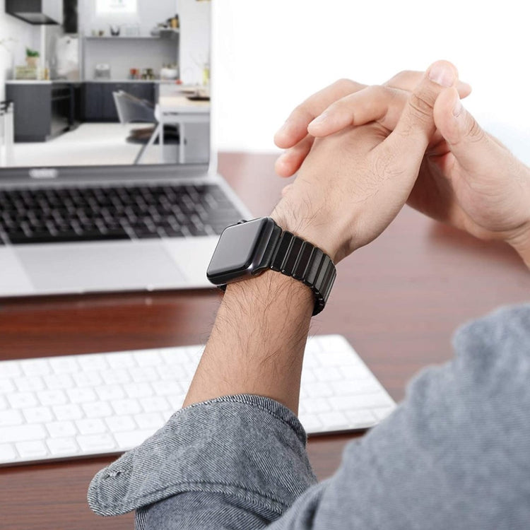 Dette armbånd er den perfekte løsning for dem, der ønsker et stilfuldt og holdbart tilbehør til deres Apple Watch. Med en poleret og børstet overflade teknologi får du et unikt finish, der skiller sig ud. Armbåndet er lavet af anodiseret 304L rustfrit stål, hvilket sikrer en glat berøring, slidstyrke og høj hårdhed. Desuden er det rustbestandigt, så du kan være sikker på, at det holder sig flot i lang tid. Armbåndet har en simpel frigørelsesknap på begge sider, hvilket gør det nemt at lukke og åbne, samtidig med at det sikkert holder sig på dit håndled. Det passer til håndledsomkreds på 5.67-7.87 tommer (144-200 mm), hvilket gør det til et alsidigt valg for de fleste brugere. Med en størrelse på 19.32.20.3 cm og en vægt på kun 98 gram, er dette armbånd både let og behageligt at have på hele dagen. Opgrader dit Apple Watch med dette overlegne armbånd og oplev en kombination af funktionalitet og elegance.