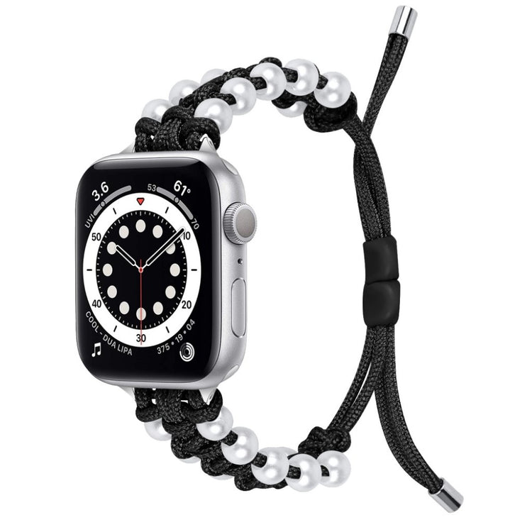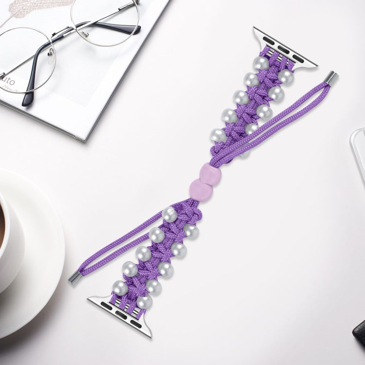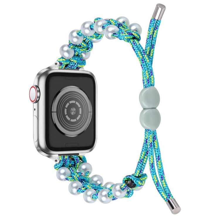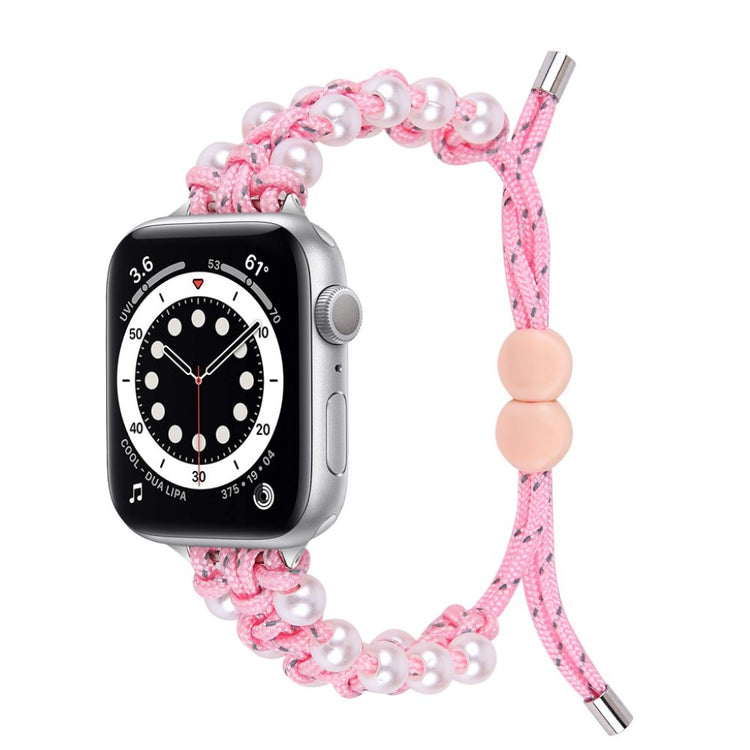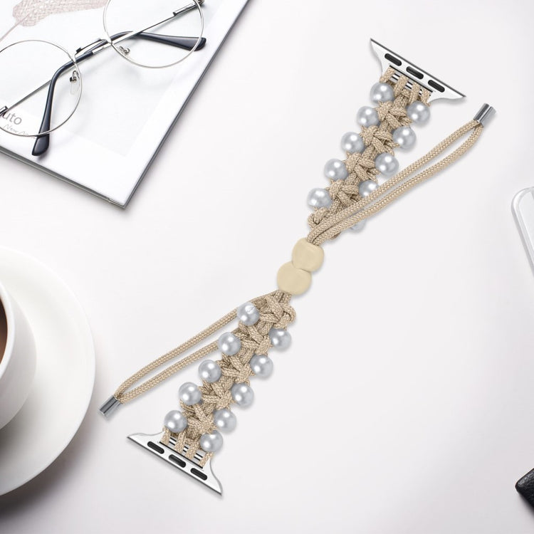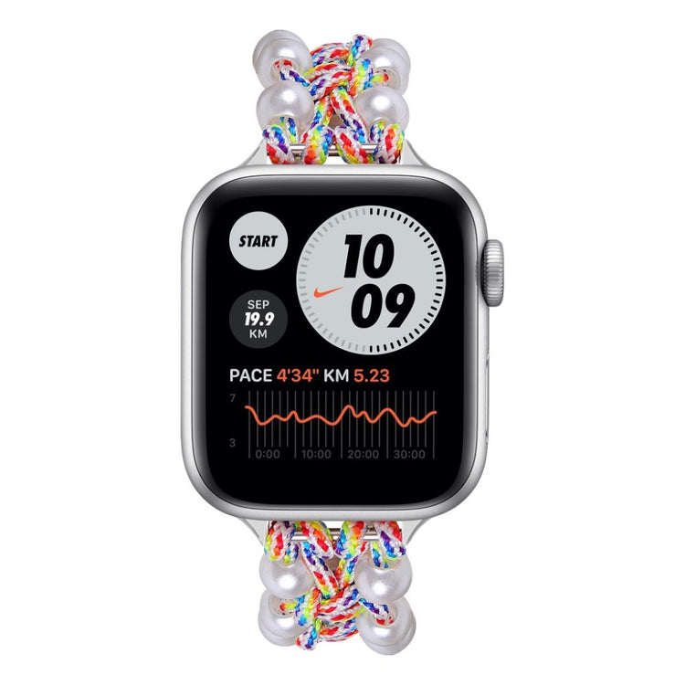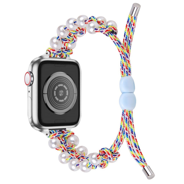 Udskiftningsurrem i flettet nylon med kunstige perler. Denne justerbare urrem er kompatibel med Apple Watch 8 41mm / 7 41mm / Series 4 / 5 / 6 / SE / SE(2022) 42mm / Watch Series 1 / 2 / 3 38mm.