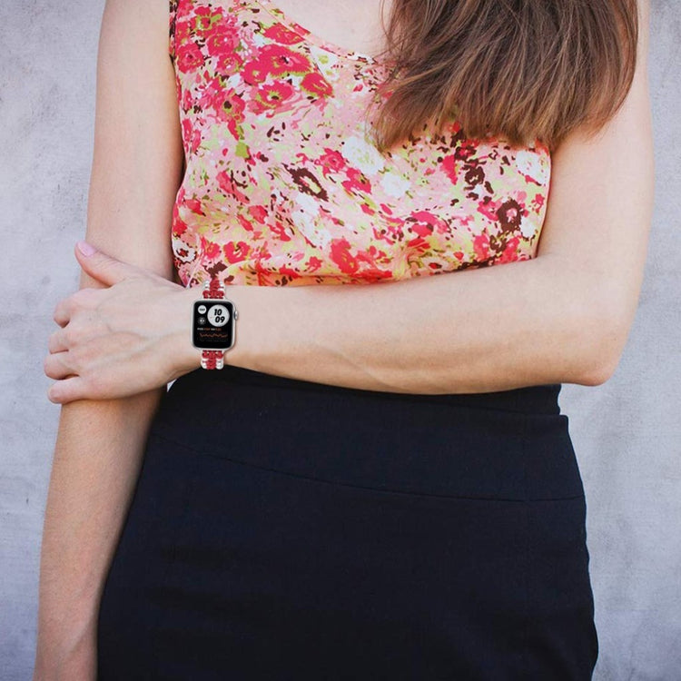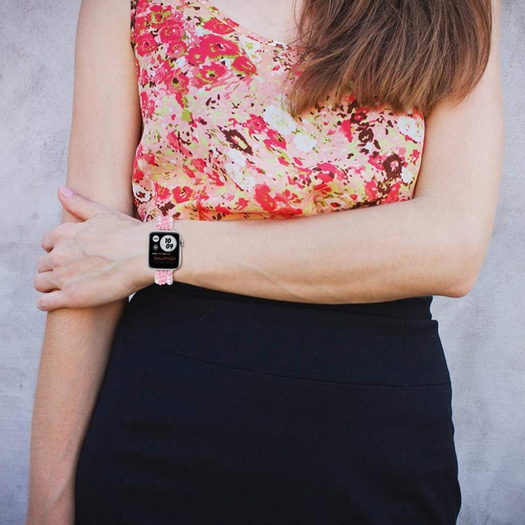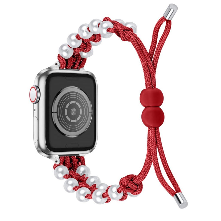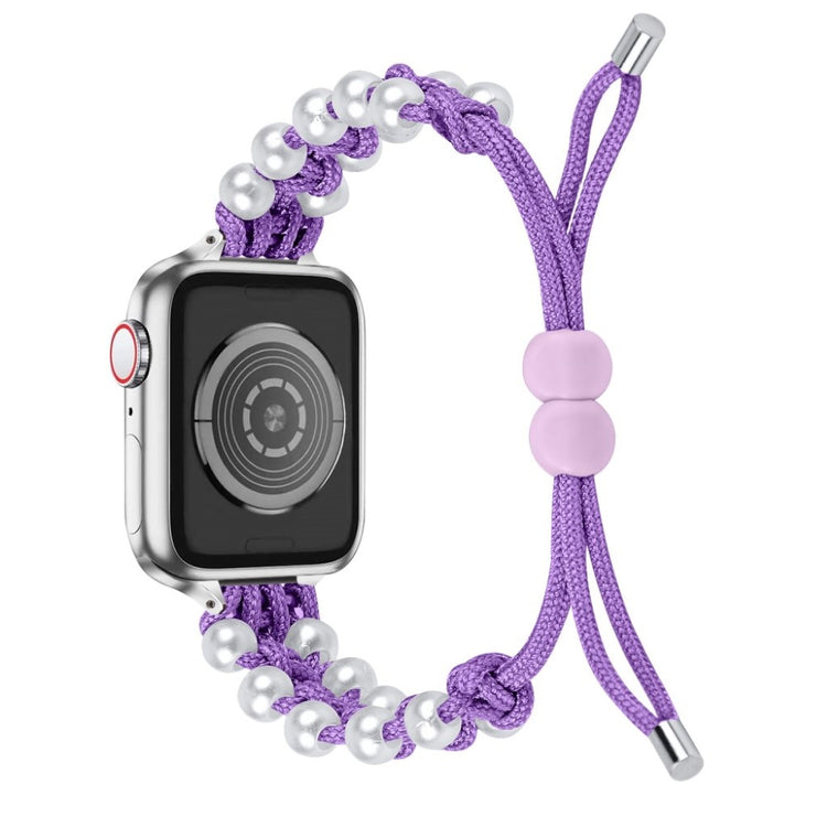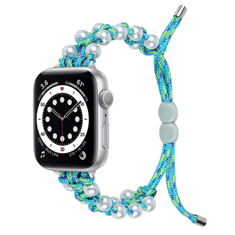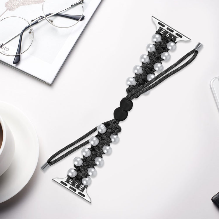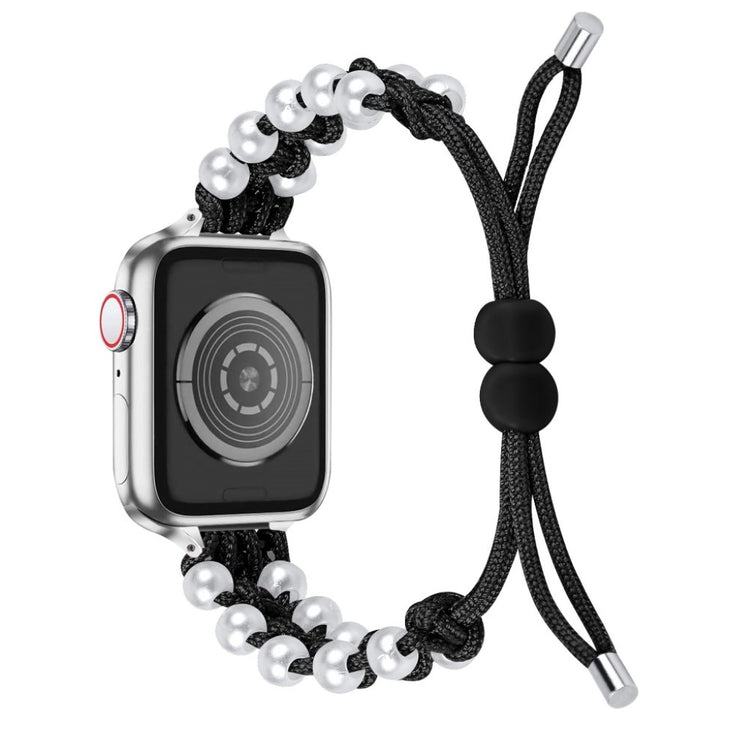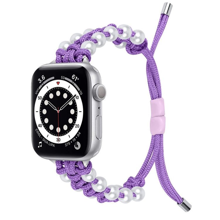 Udskiftningsurrem i flettet nylon med kunstige perler. Denne justerbare urrem er kompatibel med Apple Watch 8 41mm / 7 41mm / Series 4 / 5 / 6 / SE / SE(2022) 42mm / Watch Series 1 / 2 / 3 38mm.