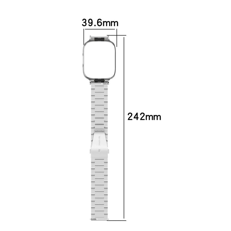 Dette armbånd til smartur er lavet af højkvalitets metalmateriale og har en holdbar design med en foldbar spænde. Armbåndet kombineres med et urcase, som giver ekstra beskyttelse til dit ur, og har en glat overflade, der gør det behageligt at have på. Den totale længde er 242 mm, med et urcase på 39,6 mm, og det passer til håndled med omkredse fra 5,5" til 8,7".
